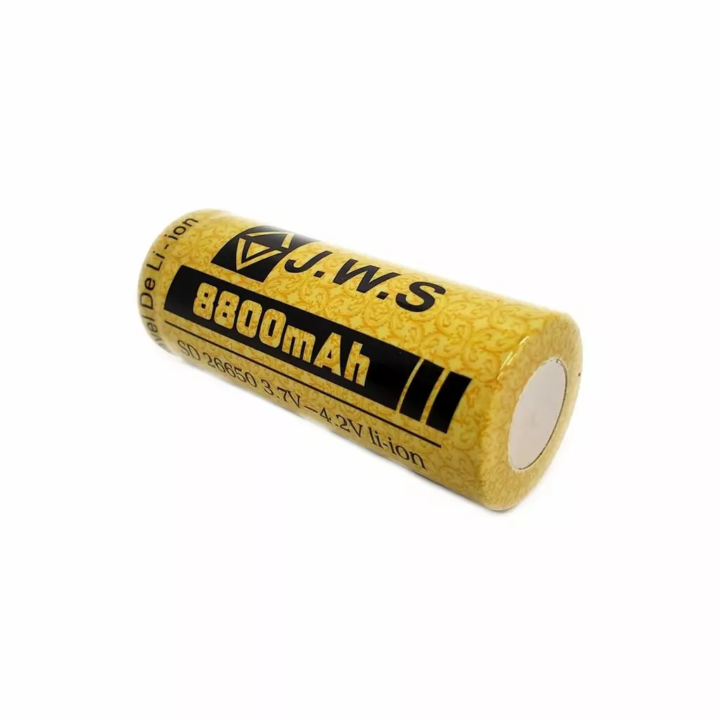 Marca: JWS Modelo: 26650 Voltagem: 3,7v Capacidade: 8.800mAh Peso: 79g Medidas: 6,5cm x 2,6cm