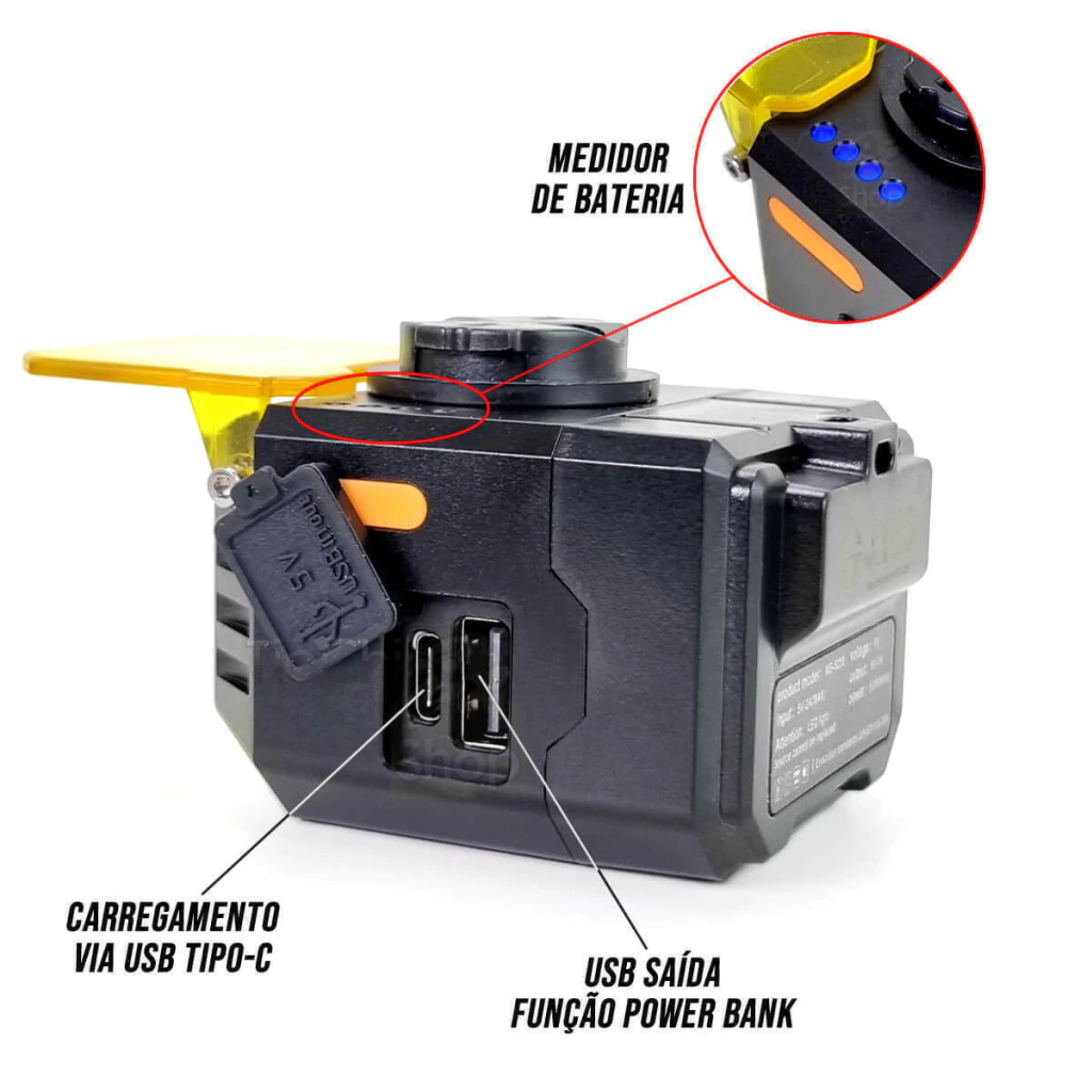 Farol recarregável via USB tipo-C