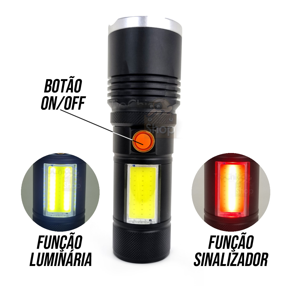No corpo da lanterna possui 15 Leds COB com função luminária