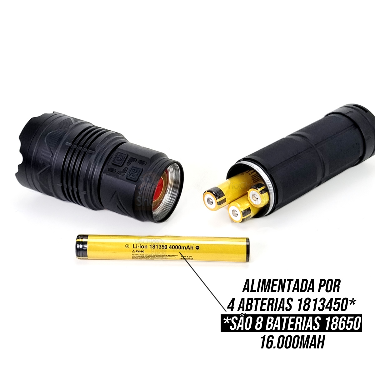 Alimentado por 4 baterias 181350 com 4.000mAh cada(são 8 baterias 18650)